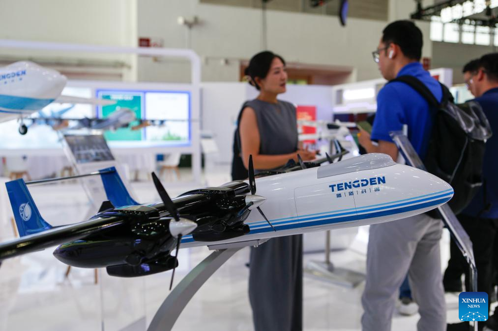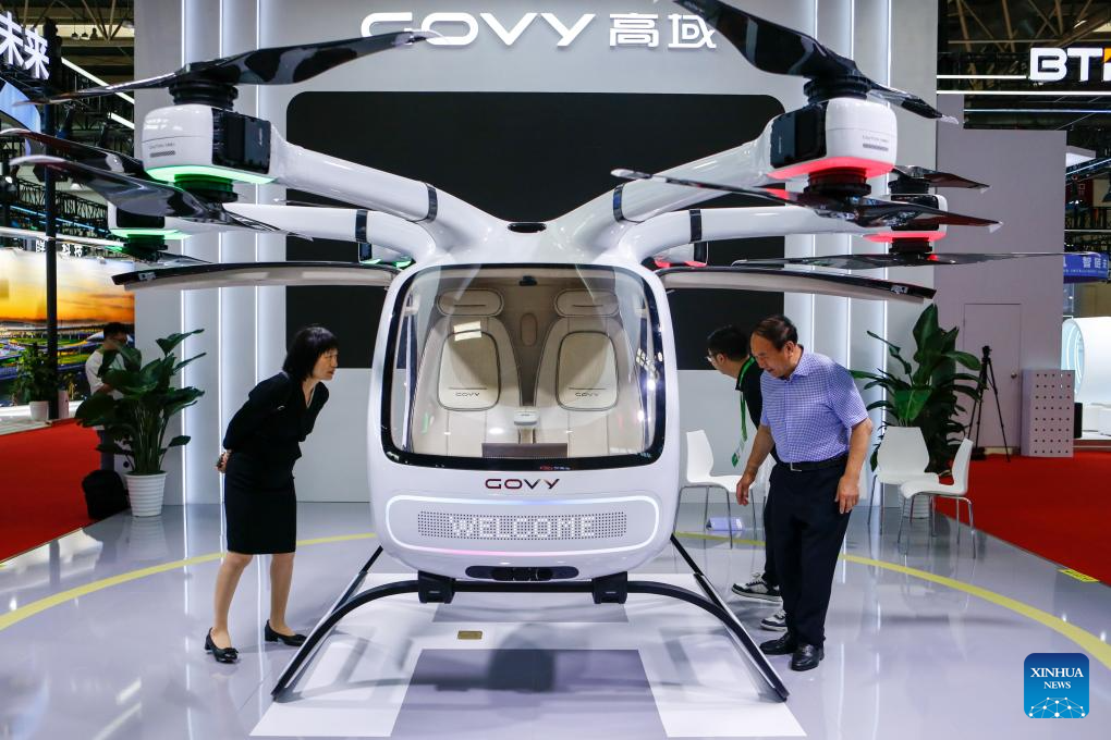 Visitors learn about a low-altitude aircraft at the booth of the tech company COVY in the Smart Vehicle Chain area of the third China International Supply Chain Expo (CISCE) in Beijing, capital of China, July 16, 2025. Themed on "Connecting the World for a Shared Future," the expo, hosted by the China Council for the Promotion of International Trade, kicked off in Beijing on Wednesday.