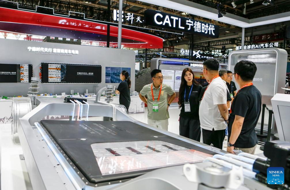 Visitors learn about battery products at the booth of Chinese electric vehicle (EV) battery maker CATL at the Smart Vehicle Chain area of the third China International Supply Chain Expo (CISCE) in Beijing, capital of China, July 16, 2025. Themed on "Connecting the World for a Shared Future," the expo, hosted by the China Council for the Promotion of International Trade, kicked off in Beijing on Wednesday.