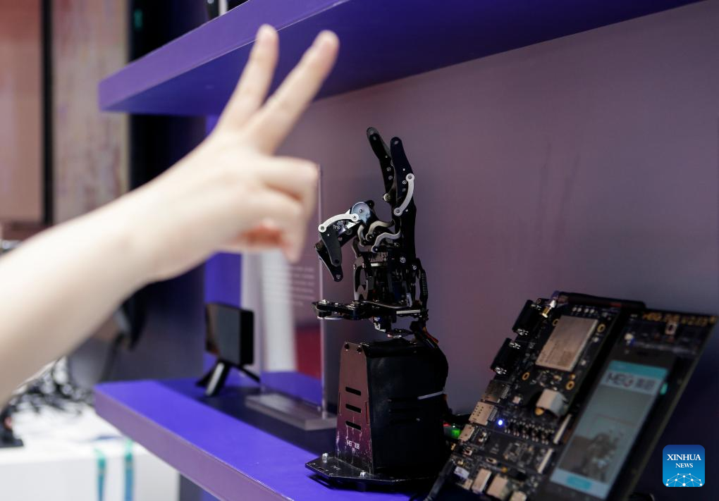 A visitor interacts with a smart bionic hand at the booth of Qualcomm in the Digital Technology Chain area of the third China International Supply Chain Expo (CISCE) in Beijing, capital of China, July 17, 2025. Themed on "Connecting the World for a Shared Future," the expo, hosted by the China Council for the Promotion of International Trade, kicked off in Beijing on Wednesday.
