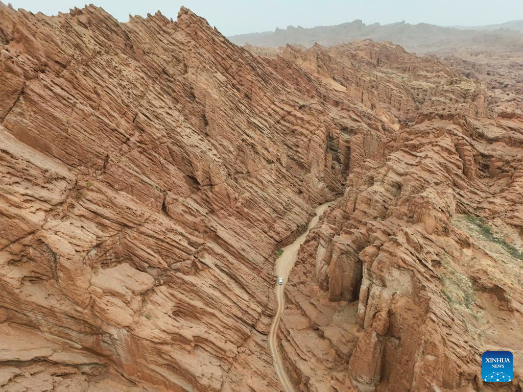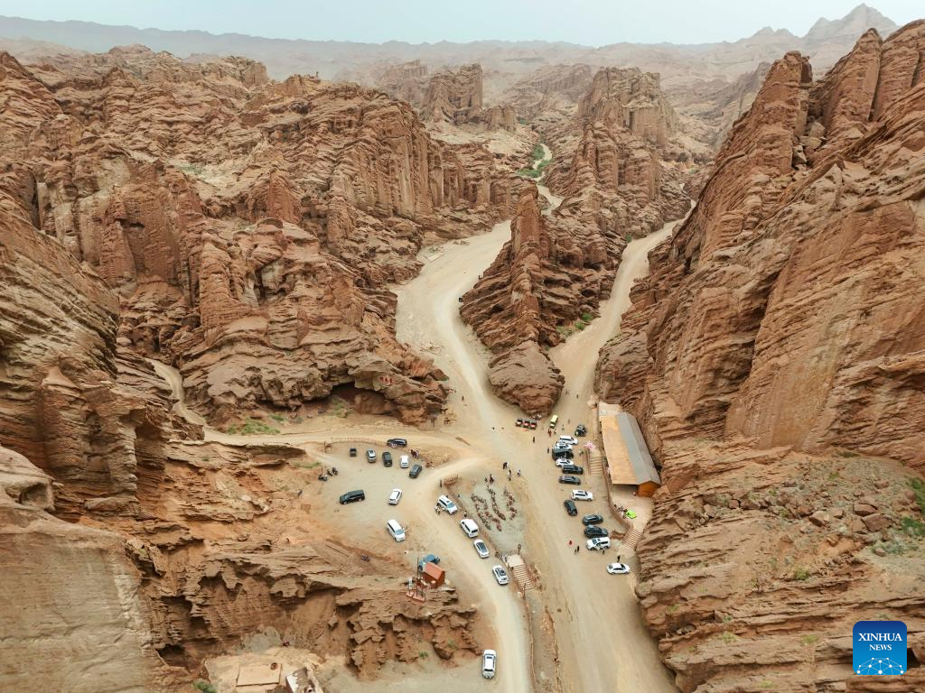 This aerial drone photo shows tourists visiting a canyon near the Duku Highway in northwest China's Xinjiang Uygur Autonomous Region, July 17, 2025. Northwest China's Duku Highway, considered one of the most scenic roads in the country, sees a tourism boom in the summer.