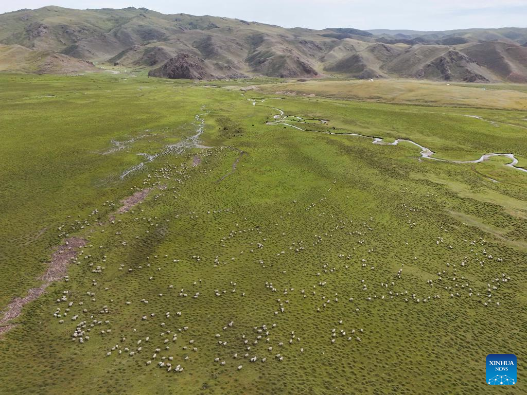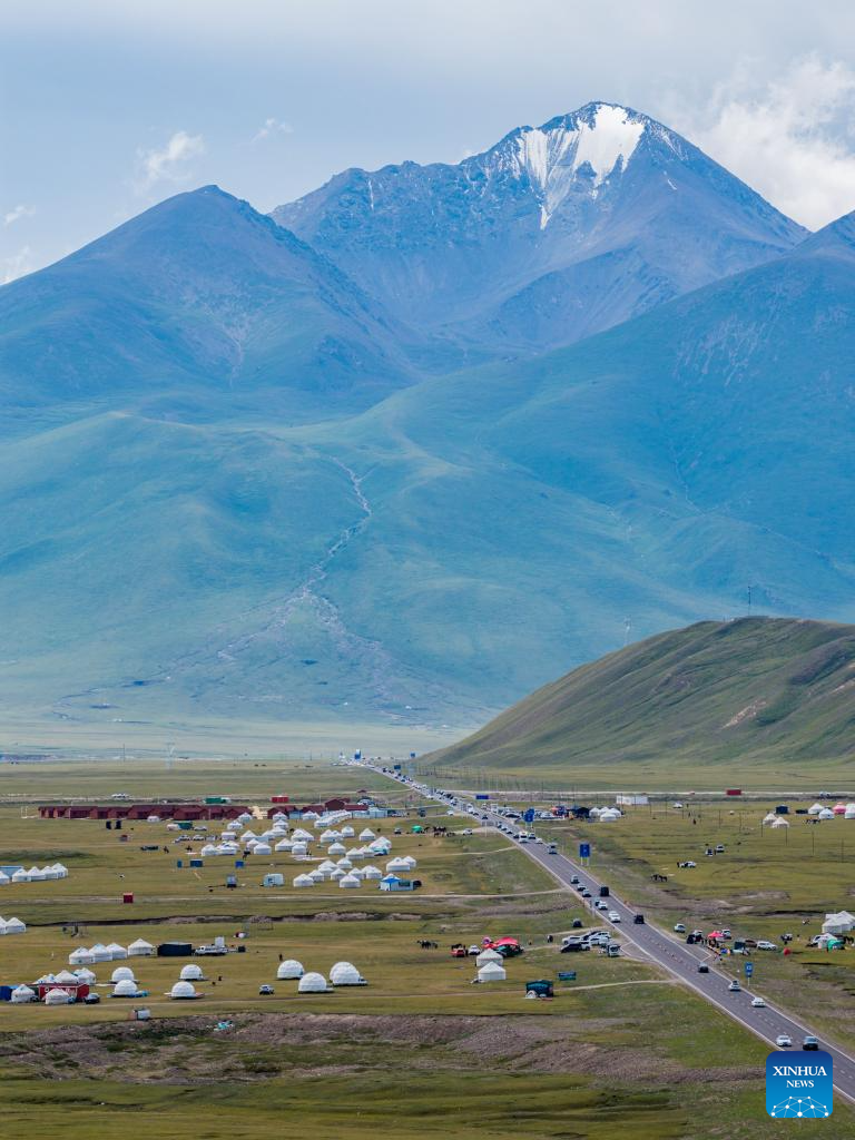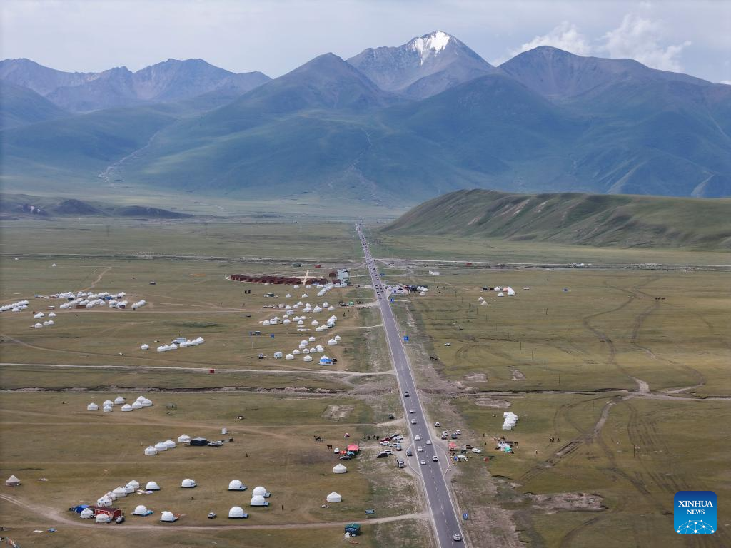 An aerial drone photo taken on July 16, 2025 shows a grassland by the Duku Highway in northwest China's Xinjiang Uygur Autonomous Region. Northwest China's Duku Highway, considered one of the most scenic roads in the country, sees a tourism boom in the summer.