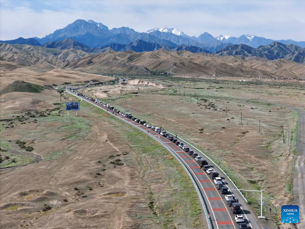 An aerial drone photo shows vehicles on the Duku Highway in northwest China's Xinjiang Uygur Autonomous Region, July 15, 2025. Northwest China's Duku Highway, considered one of the most scenic roads in the country, sees a tourism boom in the summer.