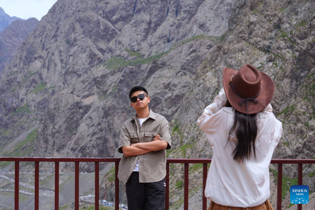 A man poses for a photo at a service area of the Duku Highway in northwest China's Xinjiang Uygur Autonomous Region, July 15, 2025. Northwest China's Duku Highway, considered one of the most scenic roads in the country, sees a tourism boom in the summer.
