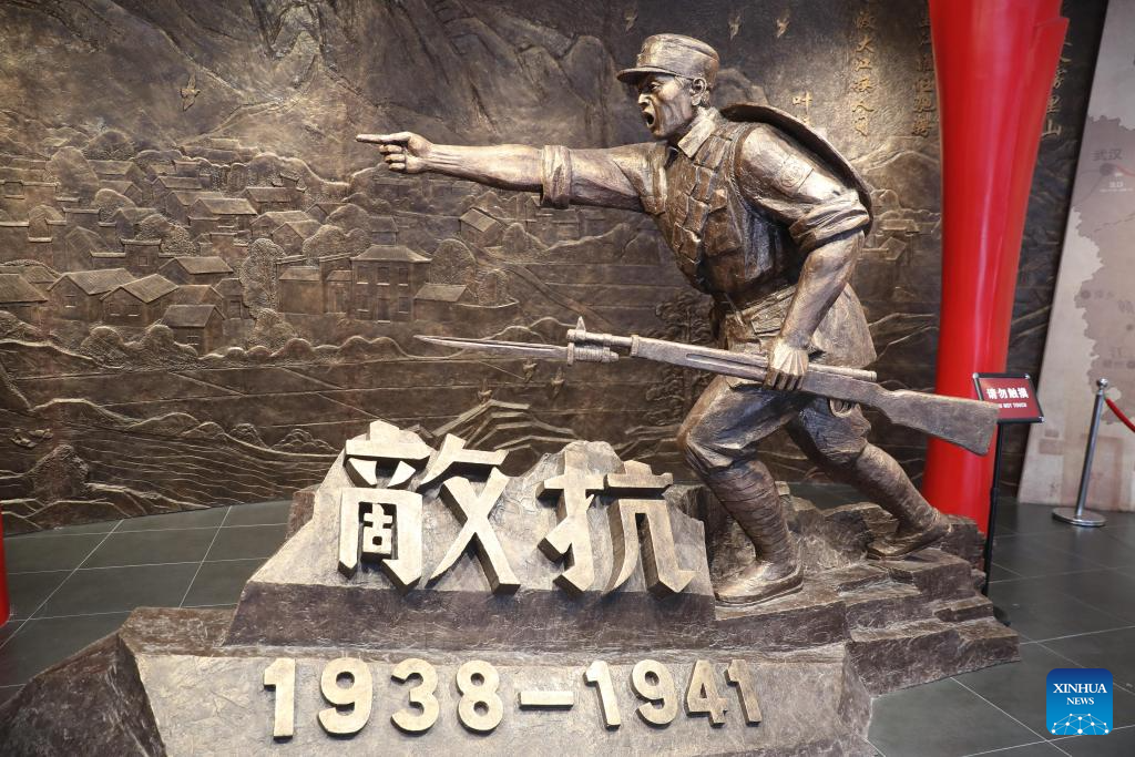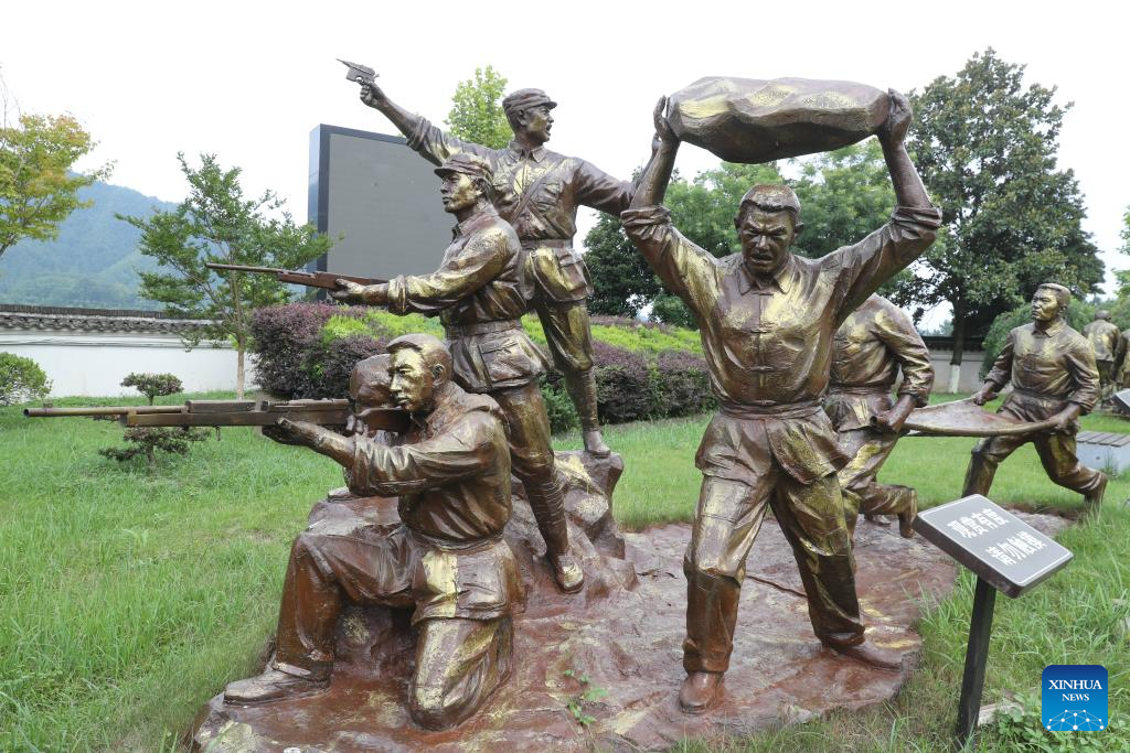 This photo taken on July 14, 2025 shows a statue at the memorial hall of the former headquarters of the New Fourth Army in Jingxian County, east China's Anhui Province. Located in Yunling Township of Jingxian County in Xuancheng City, the memorial hall covers an area of 20,000 square meters. It is one of the important heritage sites under state protection, and was established based on 11 preserved sites that the New Fourth Army headquarters had been stationed in Yunling from 1938 to 1941, during the Chinese People's War of Resistance Against Japanese Aggression. (Xinhua/Gong Bing)