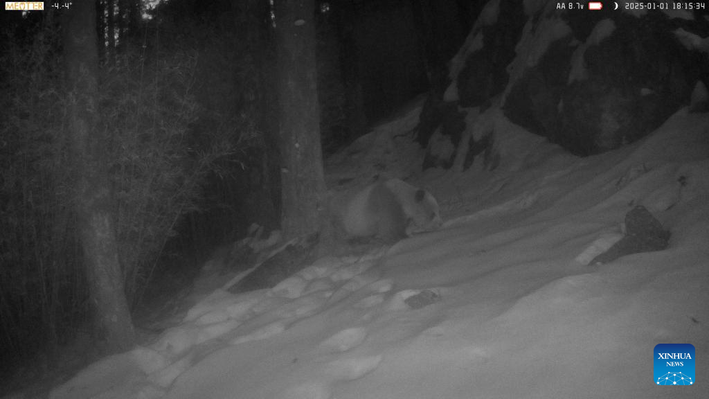 XI'AN, July 17 (Xinhua) -- Staff at the Zhouzhi National Nature Reserve Administration in northwest China's Shaanxi Province recently discovered rare footage of a brown giant panda walking in the snow while reviewing data from infrared cameras in 2025.