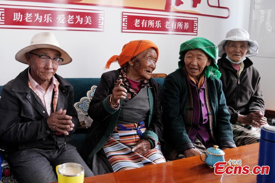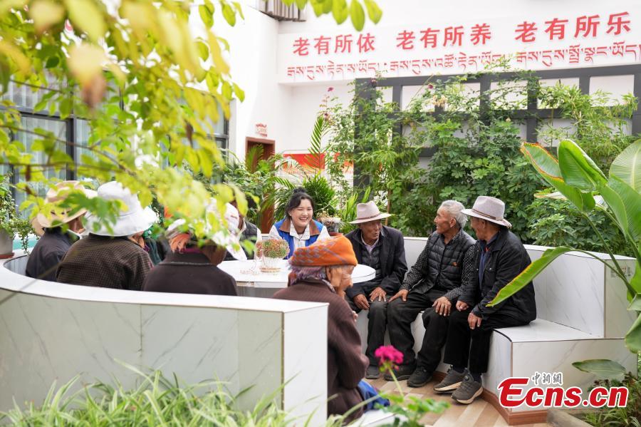 Volunteers chat with elderly people at the Wellness Center in Sanyou Village, Qushui County, Lhasa City, Xizang Autonomous Region, July 17, 2025. (China News Service/Zhang Xiangyi)