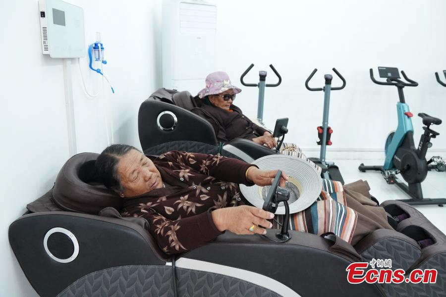 Elderly people experience massage chairs at the Wellness Center in Sanyou Village, Qushui County, Lhasa City, Xizang Autonomous Region, July 17, 2025. (China News Service/Zhang Xiangyi)