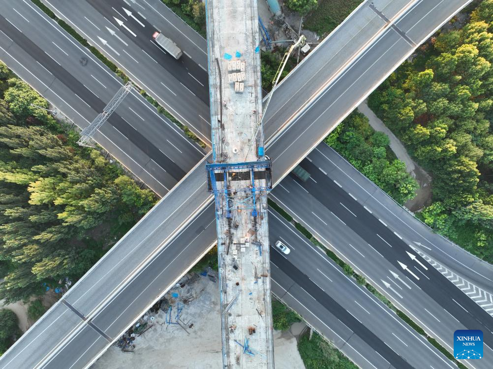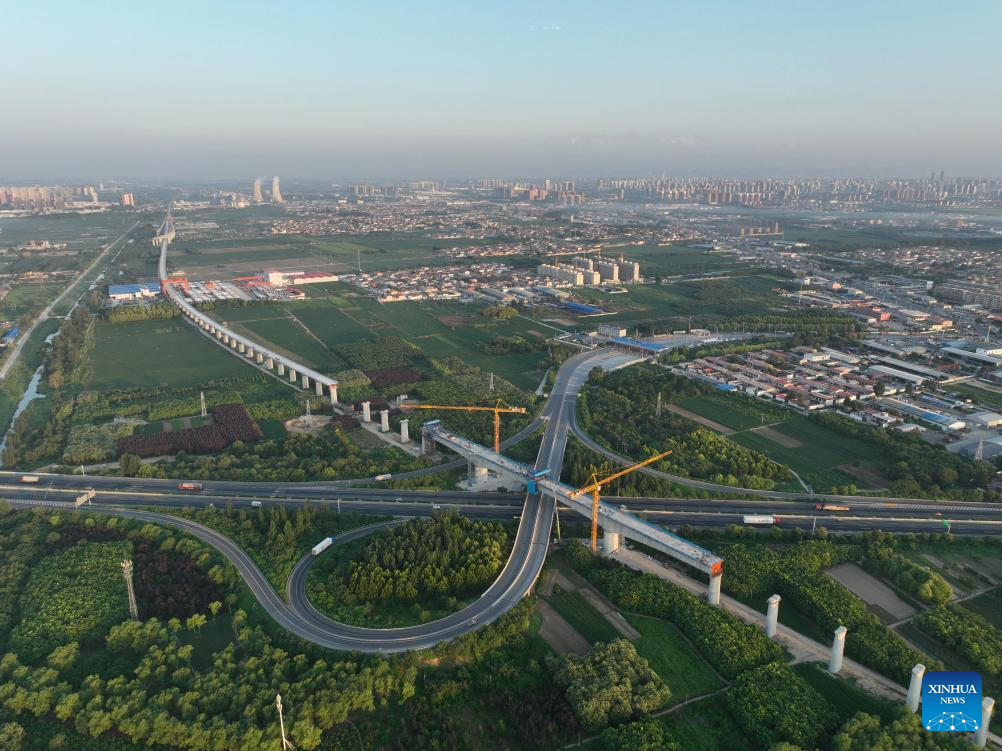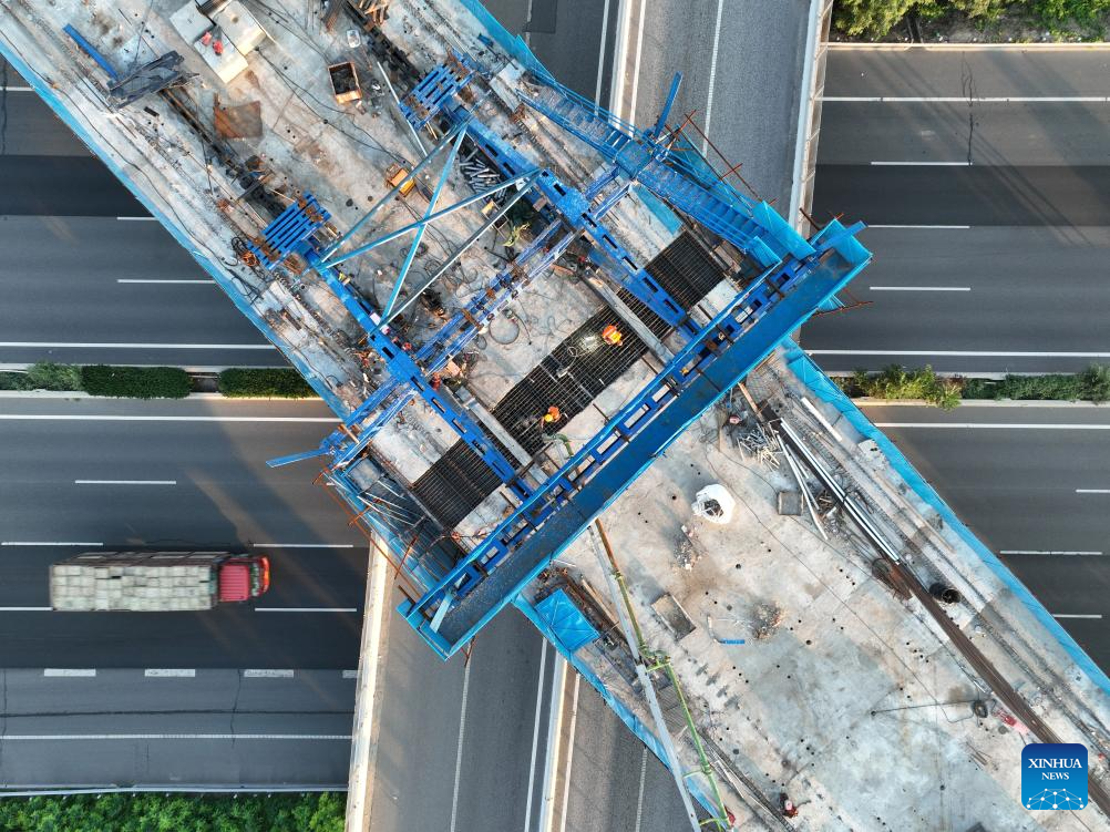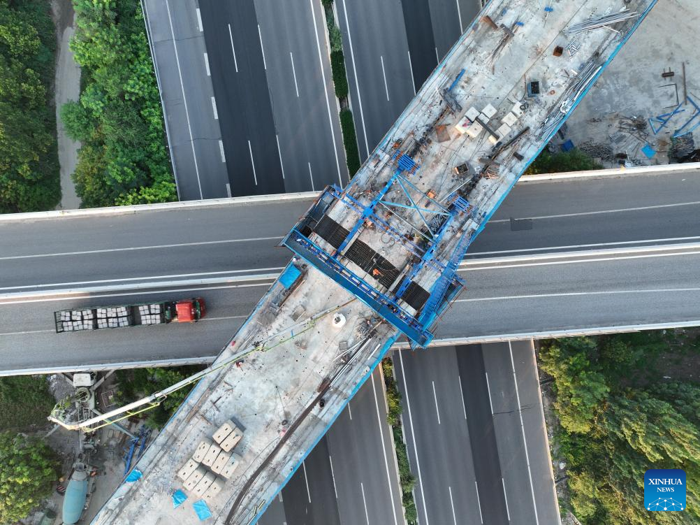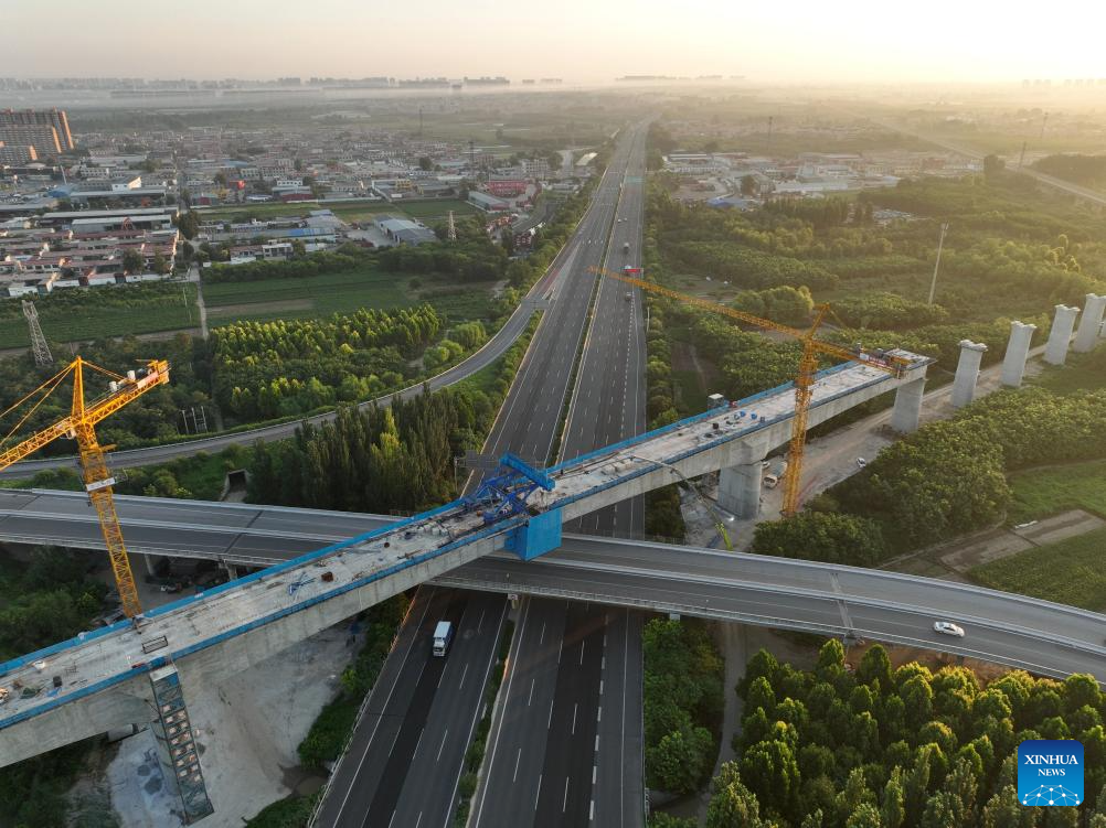 An aerial drone photo taken on July 18, 2025 shows a construction site of the middle span of the continuous beam for Baoding East super major bridge of the Xiong'an-Xinzhou high-speed railway, which crosses over the Beijing-Hong Kong-Macao expressway, in Baoding, north China's Hebei Province. The middle span built by China Railway 14th Bureau Group Co., Ltd. was successfully closed on Friday.