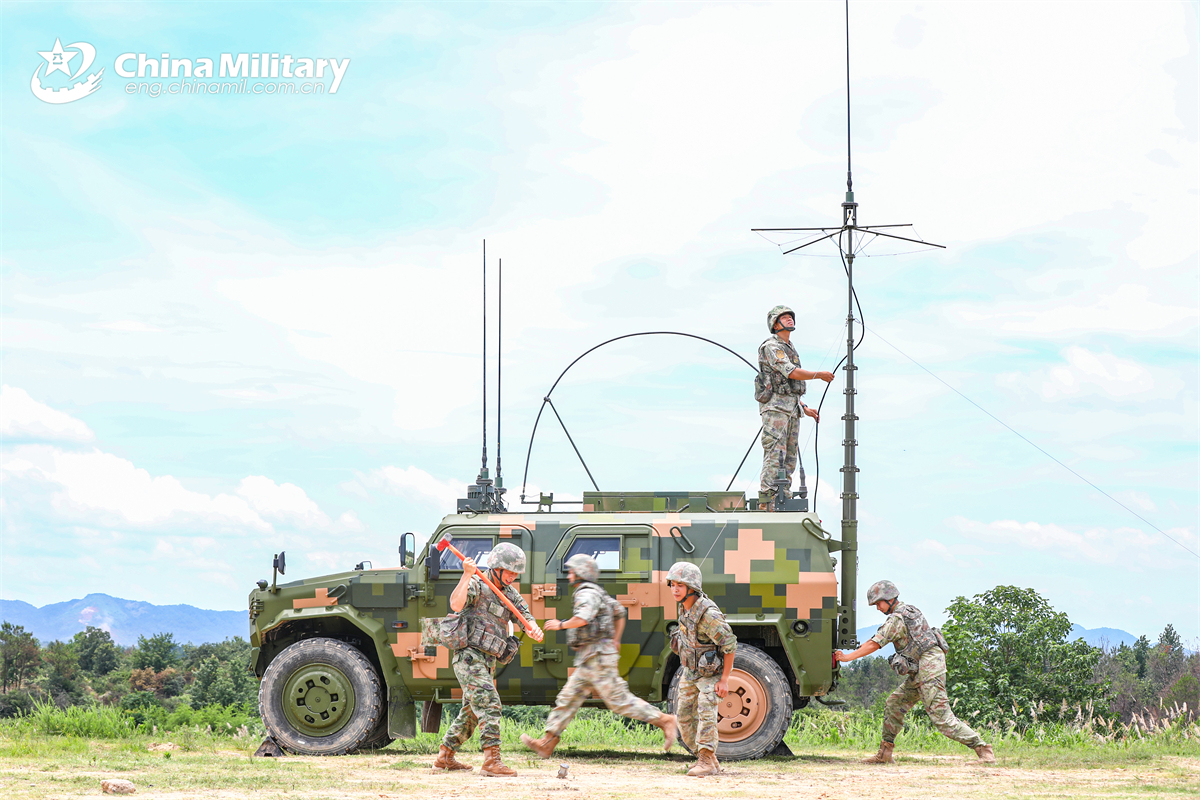 Soldiers assigned to an artillery detachment of a brigade under the Chinese PLA 72nd Group Army set up antenna system during a live-fire shooting training exercise in late June, 2025. (eng.chinamil.com.cn/Photo by Zhang Naiyou and He Fei)