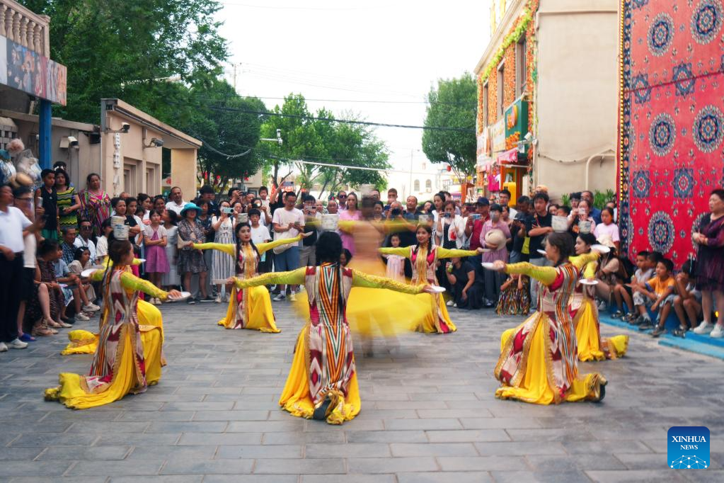 Tourists enjoy a bowl dance performance at the Qiuci Alley in Kuqa City, northwest China's Xinjiang Uygur Autonomous Region, on July 17, 2025. Kuqa City in recent years has continuously renovated and upgraded the Qiuci Alley ("Qiuci" is a Chinese pinyin form of Kuqa), which sits at the core area of the city. While retaining the original layout of the historical street, the renovation aimed to improve the habitat environment and enrich tourists' experience. (Xinhua/Zhang Keren)
