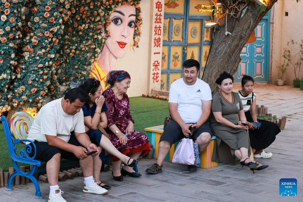 Tourists rest and chat at the Qiuci Alley in Kuqa City, northwest China's Xinjiang Uygur Autonomous Region, on July 17, 2025. Kuqa City in recent years has continuously renovated and upgraded the Qiuci Alley ("Qiuci" is a Chinese pinyin form of Kuqa), which sits at the core area of the city. While retaining the original layout of the historical street, the renovation aimed to improve the habitat environment and enrich tourists' experience. (Xinhua/Meng Tao)