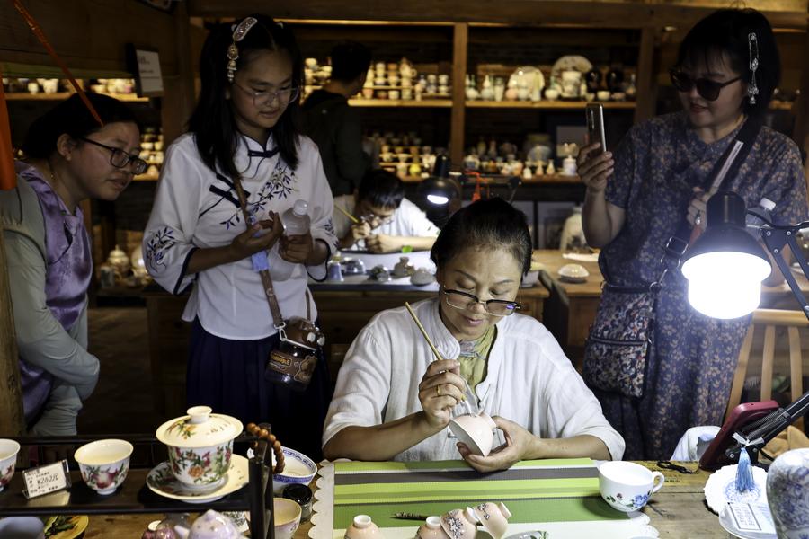 An artisan makes a ceramic product at a historical and cultural block in Jingdezhen City, east China's Jiangxi Province, July 13, 2025. (Xinhua/Liu Jinhai)