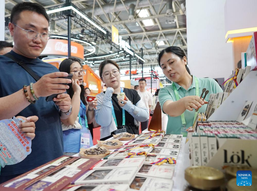 A staff member (1st R) introduces chocolates from Colombia to visitors during the third China International Supply Chain Expo (CISCE) in Beijing, capital of China, July 18, 2025. Themed "Connecting the World for a Shared Future," the 2025 CISCE runs from July 16 to 20. One highlight is the Green Agricultural Chain area, which displays world food products and the agricultural industrial chain with a focus on information-driven and intelligent farming. (Xinhua/Zhang Chenlin)