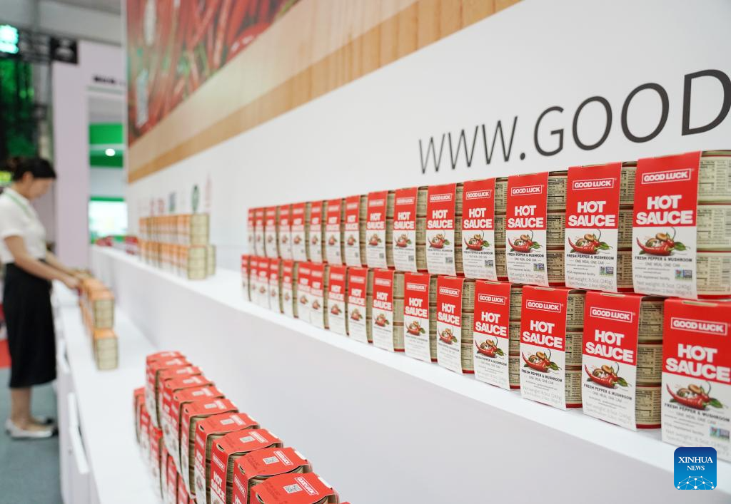 A visitor learns about a chili sauce product exported to the United States at the Green Agriculture Chain area during the third China International Supply Chain Expo (CISCE) in Beijing, capital of China, July 18, 2025. Themed "Connecting the World for a Shared Future," the 2025 CISCE runs from July 16 to 20. One highlight is the Green Agricultural Chain area, which displays world food products and the agricultural industrial chain with a focus on information-driven and intelligent farming. (Xinhua/Zhang Chenlin)
