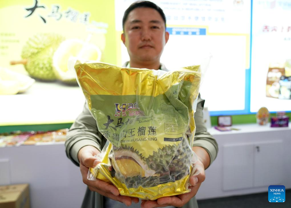 A staff member displays a frozen Musang King durian product from Malaysia during the third China International Supply Chain Expo (CISCE) in Beijing, capital of China, July 18, 2025. Themed "Connecting the World for a Shared Future," the 2025 CISCE runs from July 16 to 20. One highlight is the Green Agricultural Chain area, which displays world food products and the agricultural industrial chain with a focus on information-driven and intelligent farming. (Xinhua/Zhang Chenlin)