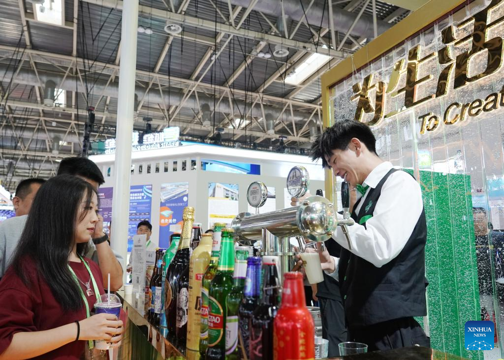 A staff member (R) serves beer to visitors at the Green Agriculture Chain area during the third China International Supply Chain Expo (CISCE) in Beijing, capital of China, July 18, 2025. Themed "Connecting the World for a Shared Future," the 2025 CISCE runs from July 16 to 20. One highlight is the Green Agricultural Chain area, which displays world food products and the agricultural industrial chain with a focus on information-driven and intelligent farming. (Xinhua/Zhang Chenlin)