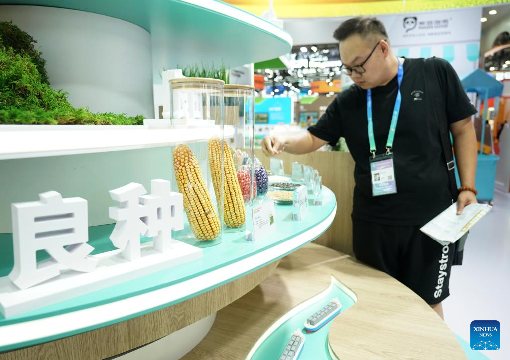 A visitor looks at the seeds displayed at the Green Agriculture Chain area during the third China International Supply Chain Expo (CISCE) in Beijing, capital of China, July 18, 2025. Themed "Connecting the World for a Shared Future," the 2025 CISCE runs from July 16 to 20. One highlight is the Green Agricultural Chain area, which displays world food products and the agricultural industrial chain with a focus on information-driven and intelligent farming. (Xinhua/Zhang Chenlin)