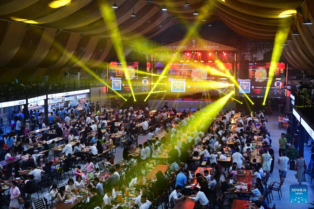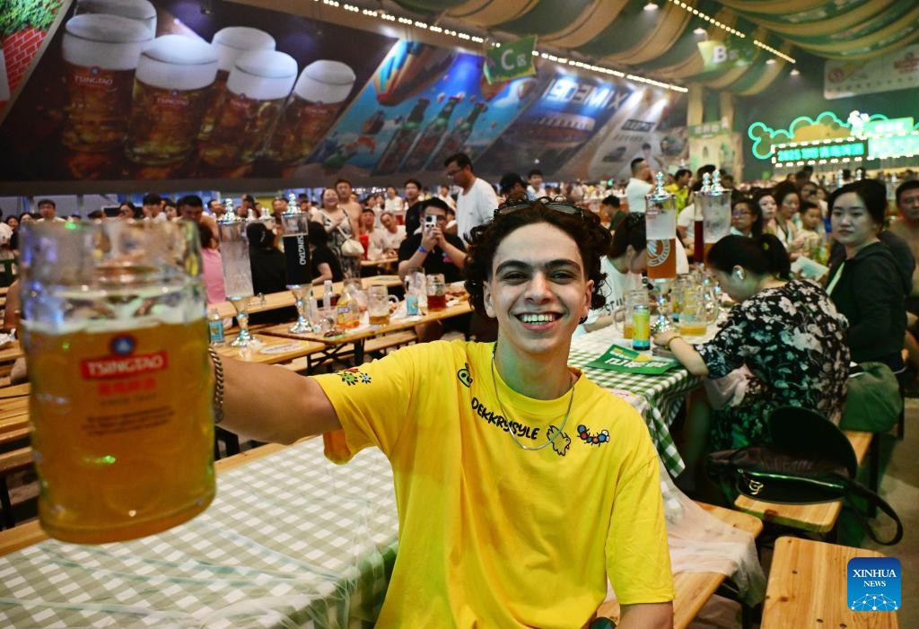 Visitors attend the 35th Qingdao International Beer Festival at the Xihai'an (West Coast) New Area in Qingdao, east China's Shandong Province, July 18, 2025. The 30-day festival kicked off here on Friday, gathering over 2,300 domestic and foreign beer brands. The festival also features a series of activities, including art parades, craft beer competition, concerts, King of Beer competition, animation carnival and fashion sports festival. (Xinhua/Li Ziheng)