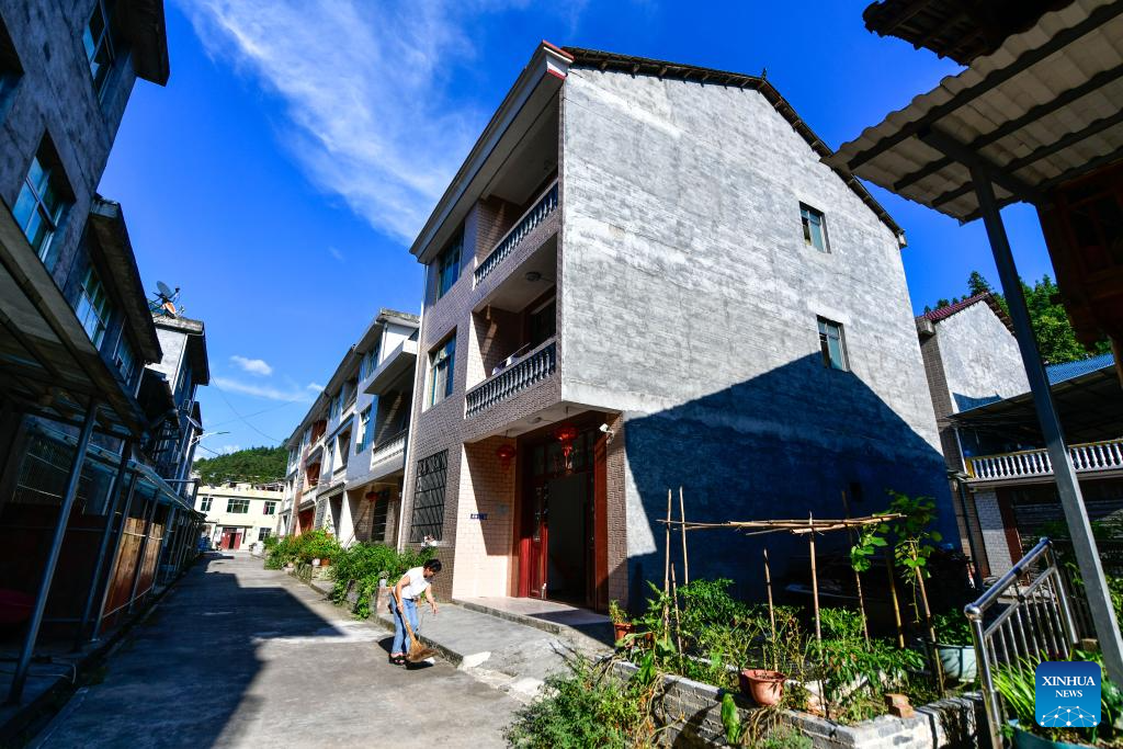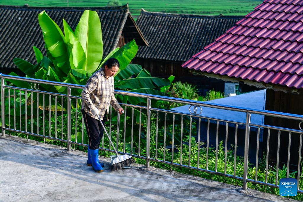 A villager cleans a courtyard in Gaoniang Village of Tianzhu County, Qiandongnan Miao and Dong Autonomous Prefecture, southwest China's Guizhou Province, July 16, 2025. In recent years, Tianzhu County has boosted rural revitalization by improving residents' living environment. (Xinhua/Yang Wenbin)