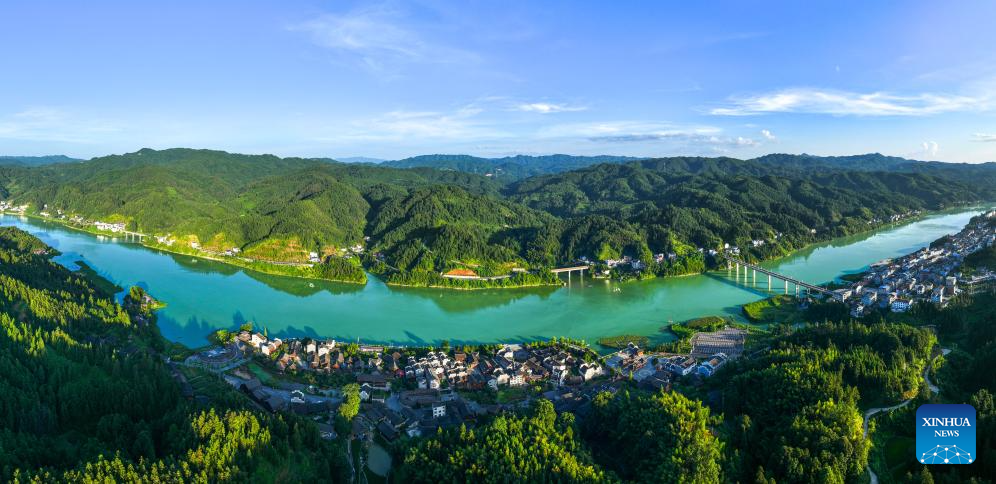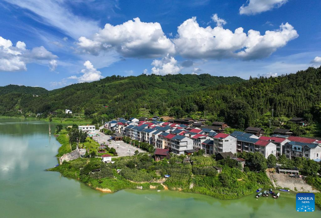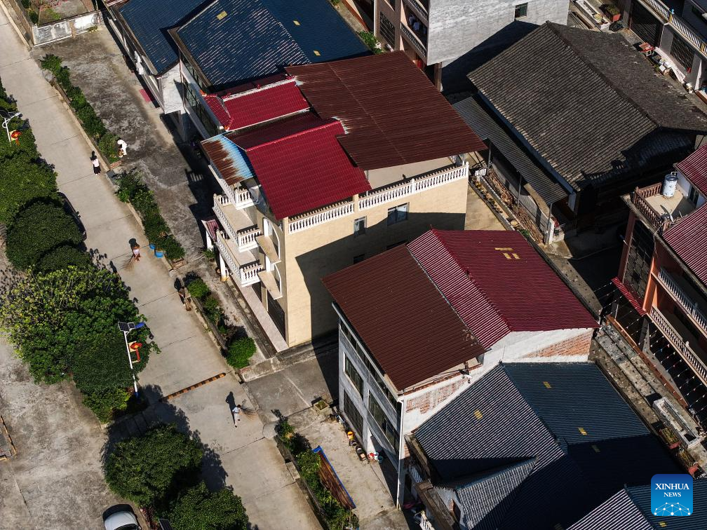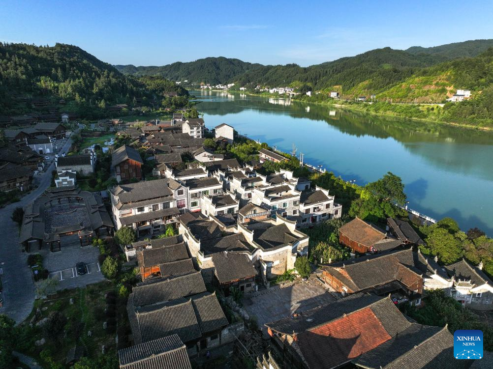 An aerial drone photo taken on July 15, 2025 shows the scenery of Qinghua Village of Tianzhu County, Qiandongnan Miao and Dong Autonomous Prefecture, southwest China's Guizhou Province. In recent years, Tianzhu County has boosted rural revitalization by improving residents' living environment. (Xinhua/Yang Wenbin)