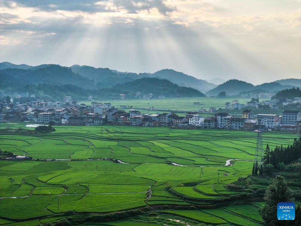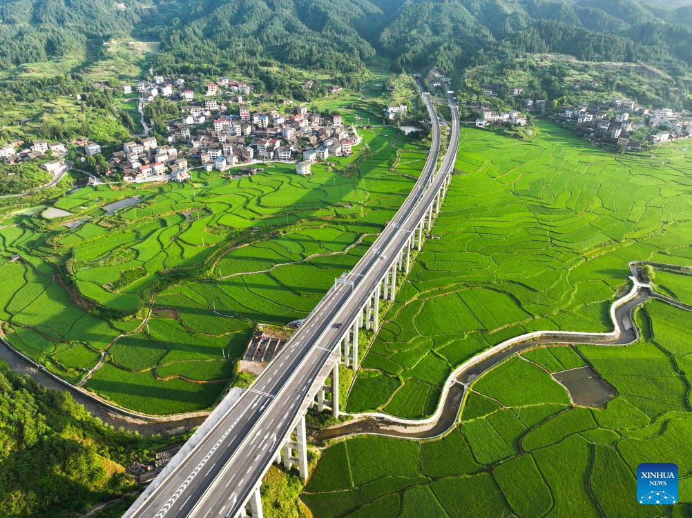 An aerial drone photo taken on July 16, 2025 shows the scenery of Gaoniang Township of Tianzhu County, Qiandongnan Miao and Dong Autonomous Prefecture, southwest China's Guizhou Province. In recent years, Tianzhu County has boosted rural revitalization by improving residents' living environment. (Xinhua/Yang Wenbin)