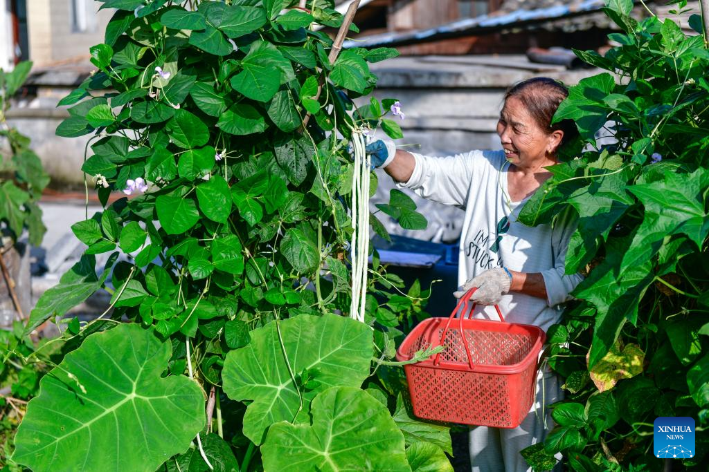 A villager picks vegetables at a garden outside her house in Gaoniang Village of Tianzhu County, Qiandongnan Miao and Dong Autonomous Prefecture, southwest China's Guizhou Province, July 16, 2025. In recent years, Tianzhu County has boosted rural revitalization by improving residents' living environment. (Xinhua/Yang Wenbin)