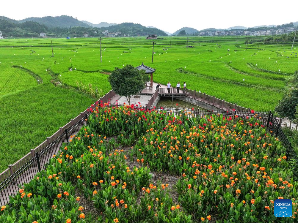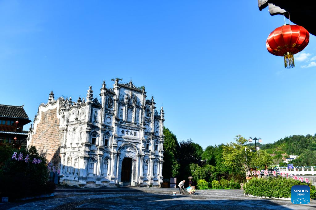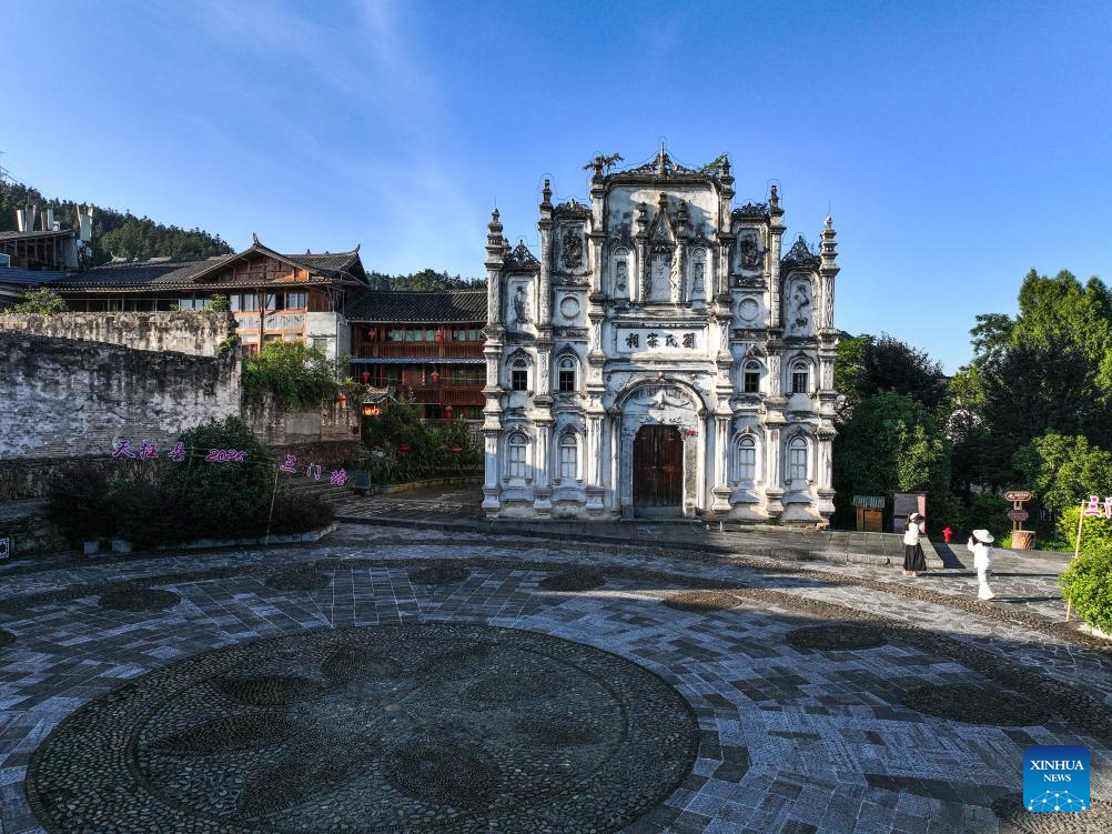 Tourists play at a square in Sanmentang Village of Tianzhu County, Qiandongnan Miao and Dong Autonomous Prefecture, southwest China's Guizhou Province, July 15, 2025. In recent years, Tianzhu County has boosted rural revitalization by improving residents' living environment. (Xinhua/Yang Wenbin)