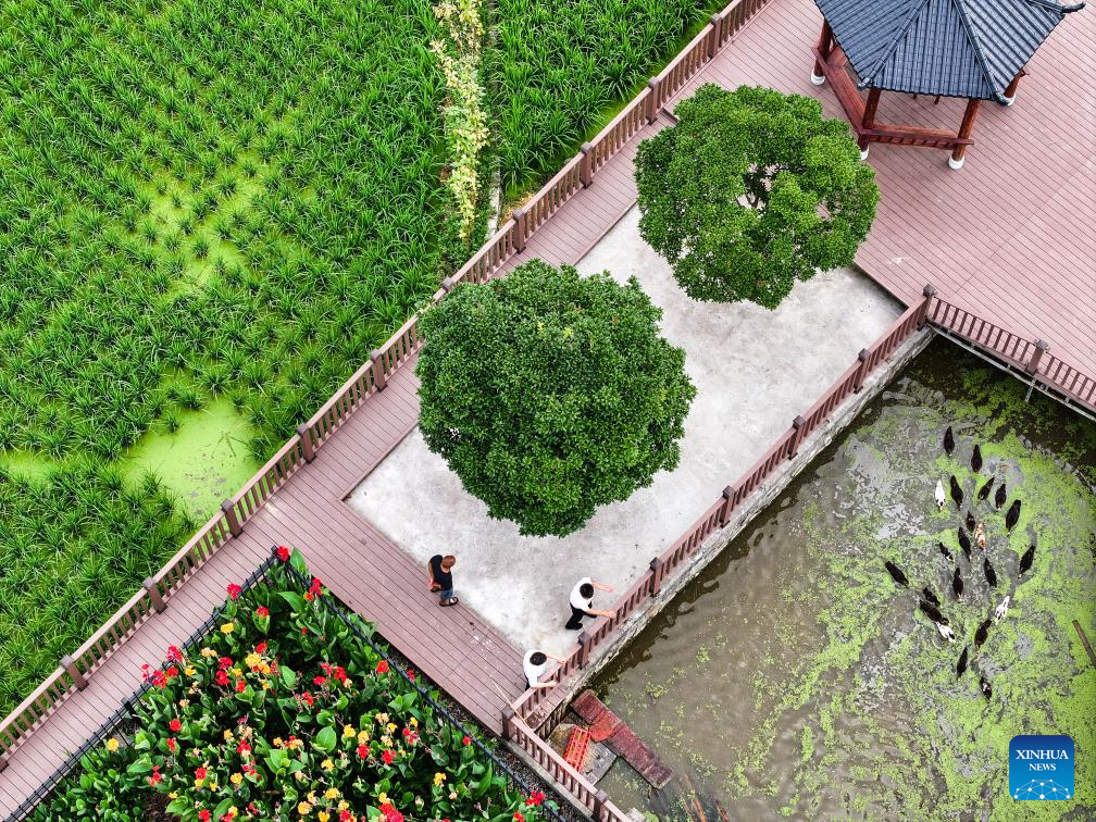 An aerial drone photo taken on July 16, 2025 shows the sewage disposal system of Gaoniang Village of Tianzhu County, Qiandongnan Miao and Dong Autonomous Prefecture, southwest China's Guizhou Province. In recent years, Tianzhu County has boosted rural revitalization by improving residents' living environment. (Xinhua/Yang Wenbin)