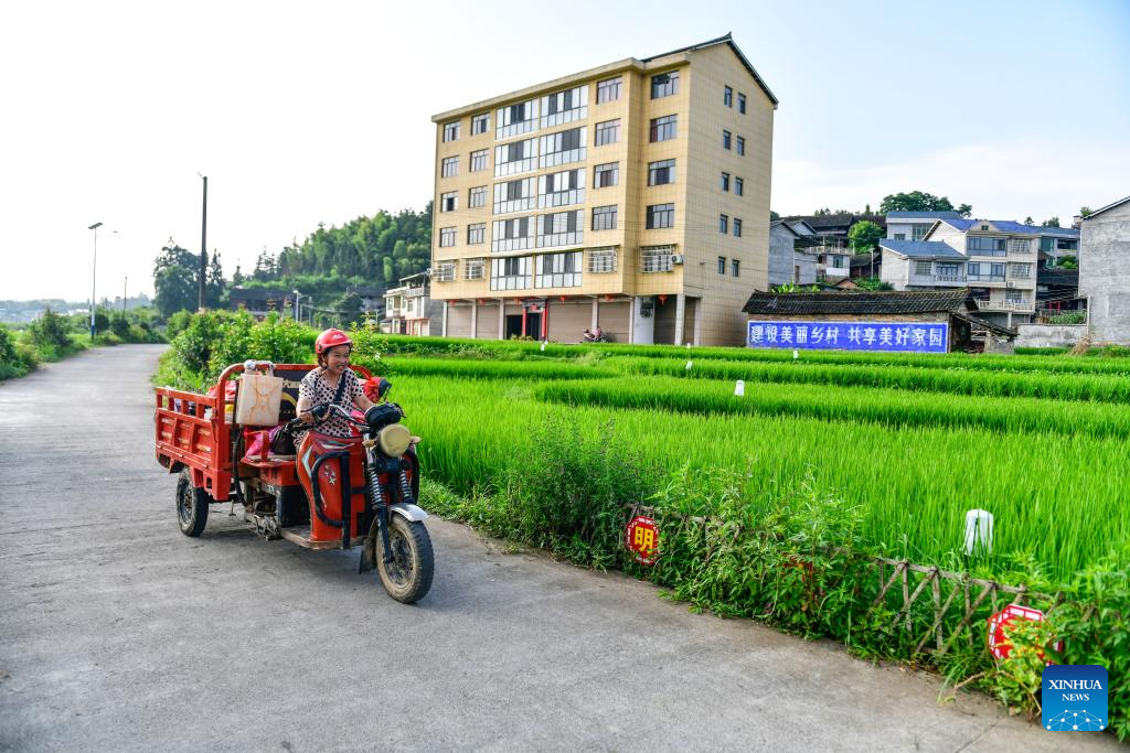 A villager drives a tricycle on a road in Gaoniang Village of Tianzhu County, Qiandongnan Miao and Dong Autonomous Prefecture, southwest China's Guizhou Province, July 16, 2025. In recent years, Tianzhu County has boosted rural revitalization by improving residents' living environment. (Xinhua/Yang Wenbin)