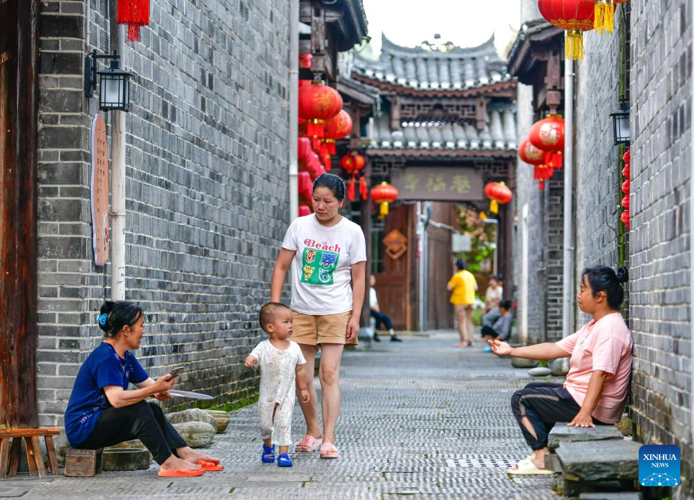 Villagers rest in an alley in Sanmentang Village of Tianzhu County, Qiandongnan Miao and Dong Autonomous Prefecture, southwest China's Guizhou Province, July 15, 2025. In recent years, Tianzhu County has boosted rural revitalization by improving residents' living environment. (Xinhua/Yang Wenbin)