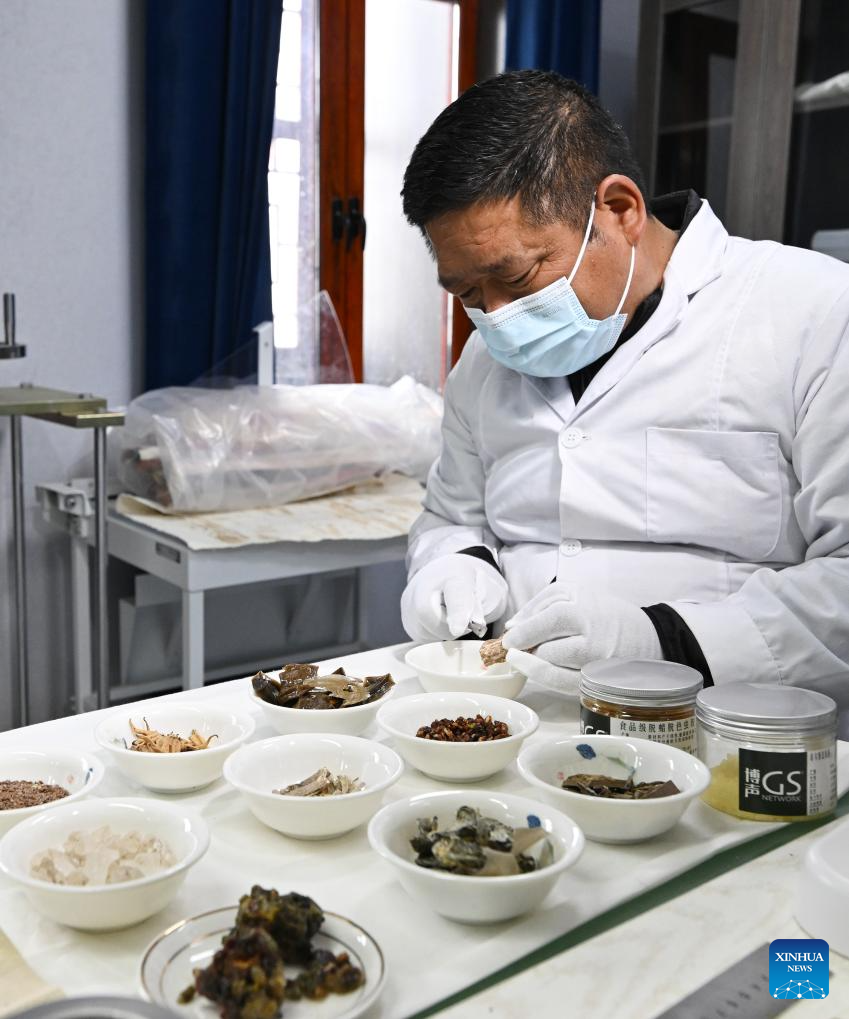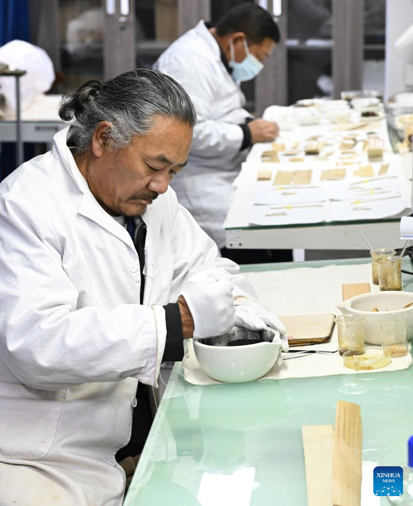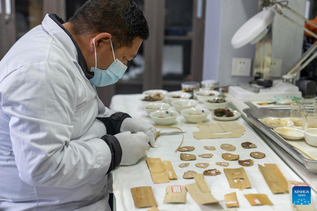 A member of an expert team on experimental repairing of Pattra-leaf Scriptures processes materials for making adhesives at Potala Palace in Lhasa, capital of southwest China's Xizang Autonomous Region, May 25, 2025. (Xinhua/Li He)