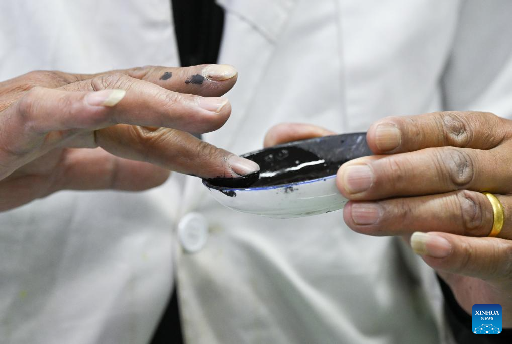 A member of an expert team on experimental repairing of Pattra-leaf Scriptures grinds pigments for repairing at Potala Palace in Lhasa, capital of southwest China's Xizang Autonomous Region, May 25, 2025. (Xinhua/Li He)