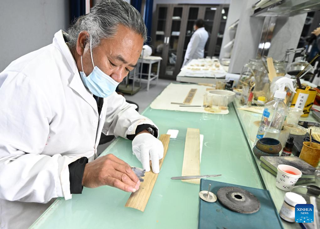 A member of an expert team on experimental repairing of Pattra-leaf Scriptures works on pattra leaves at Potala Palace in Lhasa, capital of southwest China's Xizang Autonomous Region, May 25, 2025. (Xinhua/Li He)