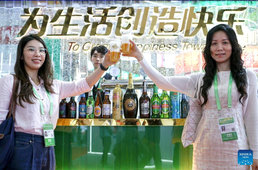 Visitors pose for photos while tasting beer at the booth of Tsingtao Beer during the third China International Supply Chain Expo (CISCE) in Beijing, capital of China, July 17, 2025. Themed on "Connecting the World for a Shared Future," the 2025 CISCE runs from July 16 to 20, gathering more than 650 companies and institutions from 75 countries, regions and international organizations. Overseas exhibitors accounted for 32 percent among all, or 3 percentage points higher compared to the previous edition. This year's event also saw more than 170 visitor delegations from abroad, and over 230 exhibitors here are first-timers. (Xinhua/Ding Hongfa)