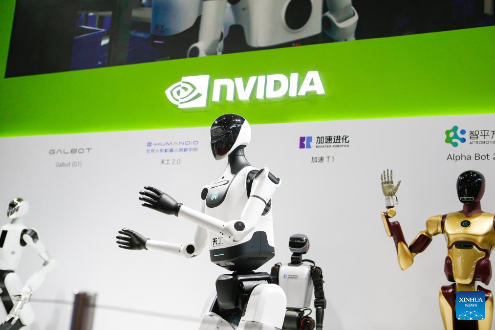 This photo taken on July 17, 2025 shows robots at the booth of Nvidia during the third China International Supply Chain Expo (CISCE) in Beijing, capital of China. Themed on "Connecting the World for a Shared Future," the 2025 CISCE runs from July 16 to 20, gathering more than 650 companies and institutions from 75 countries, regions and international organizations. Overseas exhibitors accounted for 32 percent among all, or 3 percentage points higher compared to the previous edition. This year's event also saw more than 170 visitor delegations from abroad, and over 230 exhibitors here are first-timers. (Xinhua/Ding Hongfa)