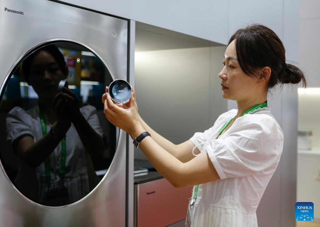 A staff member demonstrates a remote-controlled washing machine of Panasonic during the third China International Supply Chain Expo (CISCE) in Beijing, capital of China, July 17, 2025. Themed on "Connecting the World for a Shared Future," the 2025 CISCE runs from July 16 to 20, gathering more than 650 companies and institutions from 75 countries, regions and international organizations. Overseas exhibitors accounted for 32 percent among all, or 3 percentage points higher compared to the previous edition. This year's event also saw more than 170 visitor delegations from abroad, and over 230 exhibitors here are first-timers. (Xinhua/Ding Hongfa)