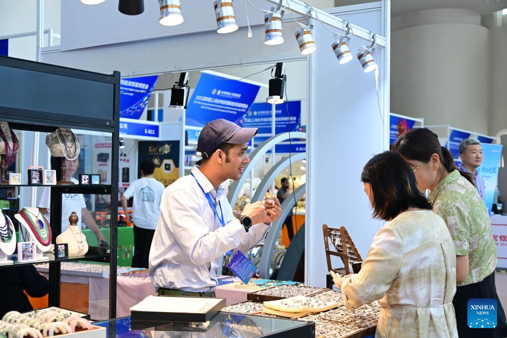 Exhibitors promote products via live-streaming during the 2025 Shanghai Cooperation Organization (SCO) International Investment and Trade Expo in Qingdao, east China's Shandong Province, July 18, 2025. Under the theme "Sharing New Opportunities, Seeking New Common Development," the expo kicked off on Friday in Qingdao. (Xinhua/Li Ziheng)