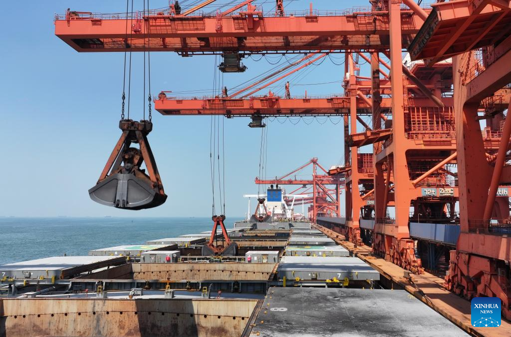 A drone photo taken on July 18, 2025 shows a ship unloading at the ore terminal of Caofeidian Port Area in Tangshan Port in Tangshan, north China's Hebei Province. The cargo throughput at Tangshan Port reached 433.56 million tonnes in the first half of 2025, up 0.75 percent year on year, according to port authorities. (Xinhua/Yang Shiyao)