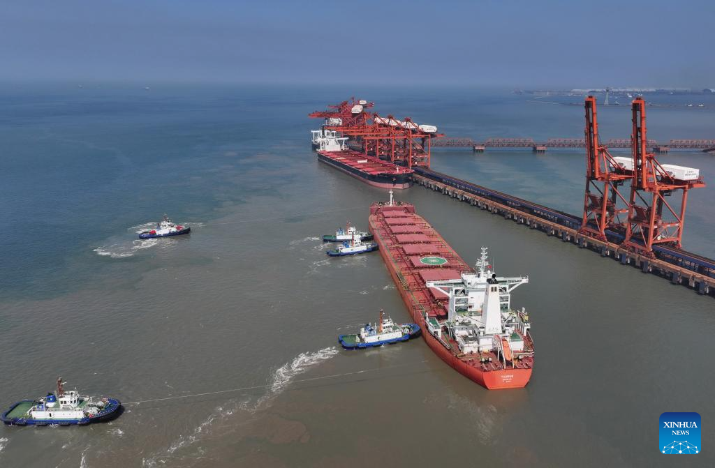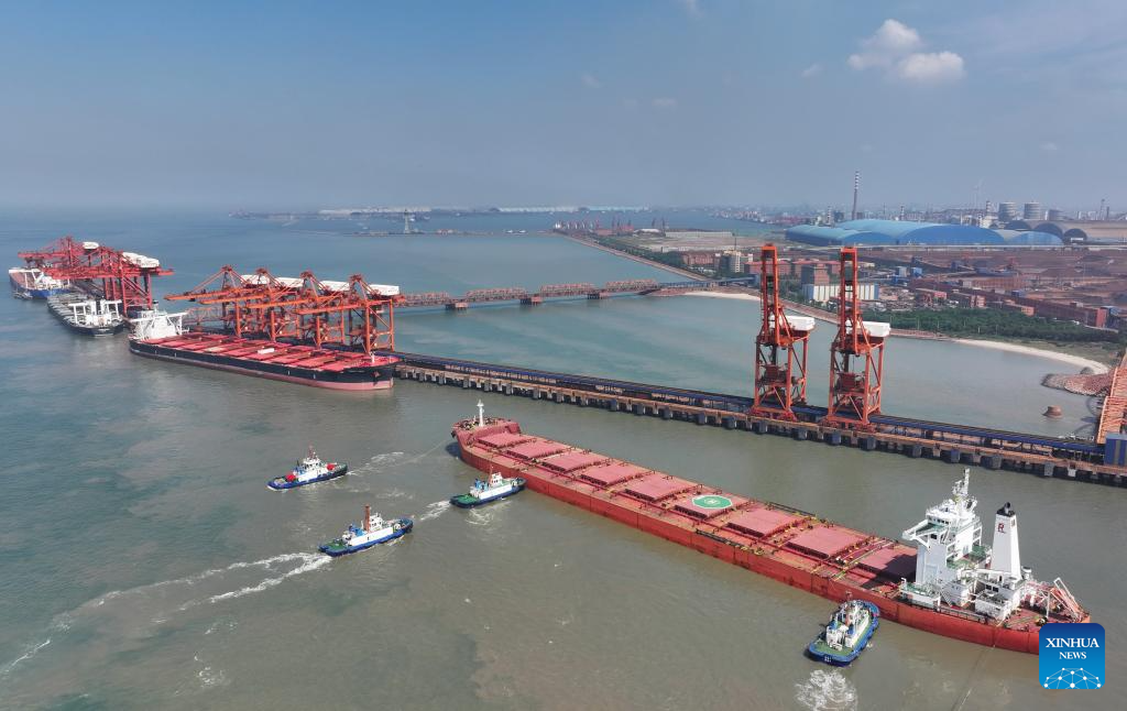 A drone photo taken on July 18, 2025 shows a cargo ship, assisted by tugboats, berthing at the ore terminal of Caofeidian Port Area in Tangshan Port in Tangshan, north China's Hebei Province. The cargo throughput at Tangshan Port reached 433.56 million tonnes in the first half of 2025, up 0.75 percent year on year, according to port authorities. (Xinhua/Yang Shiyao)