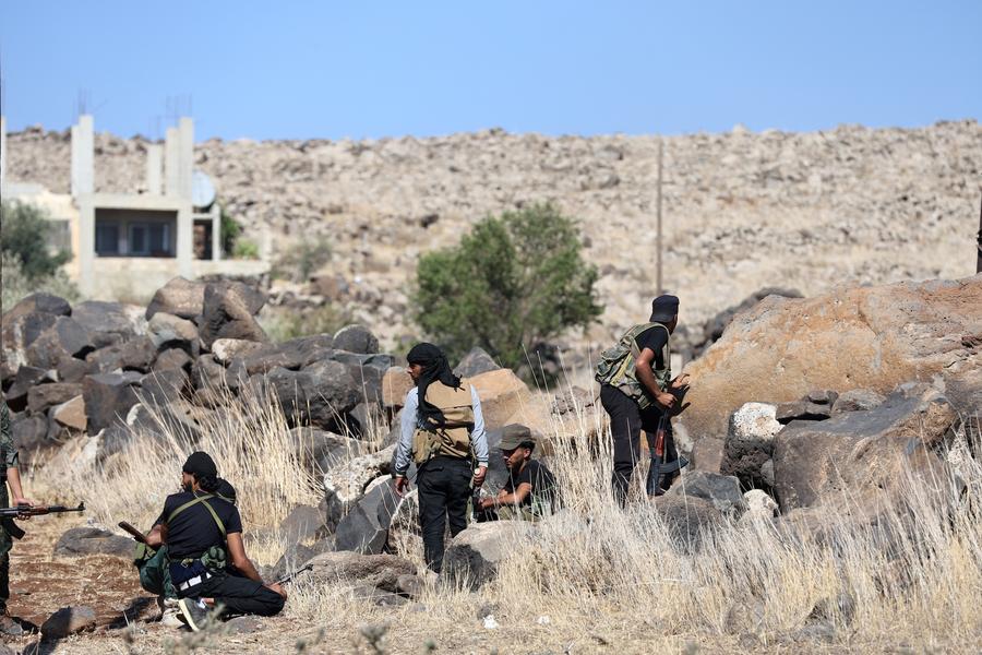Tribal fighters take positions during clashes in the town of Wolgha, western countryside of Sweida, southern Syria, on July 18, 2025. (Str/Xinhua)