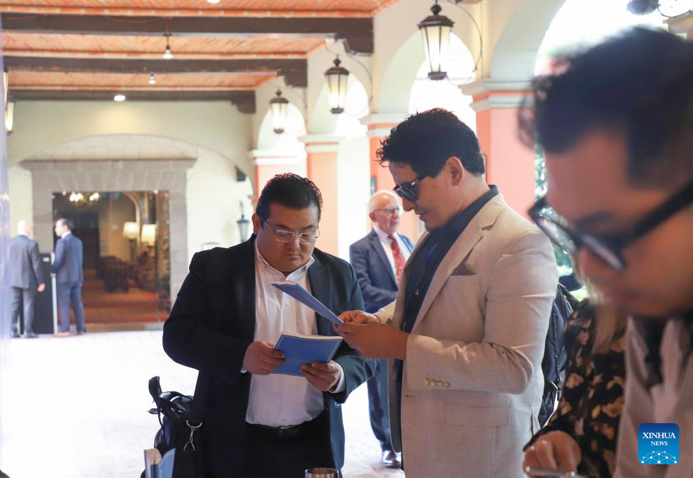 Participants read a think tank report titled "Upholding Cultural Subjectivity Amid the Dynamic Interplay of World Cultures: The Spiritual Cornerstone of China's Path to Modernization" during the "Hongting Forum: Meeting of Civilizations between China and Mexico" in Mexico City, capital of Mexico, July 18, 2025. Xinhua News Agency released the report during the forum on Friday. (Photo by Francisco Canedo/Xinhua)