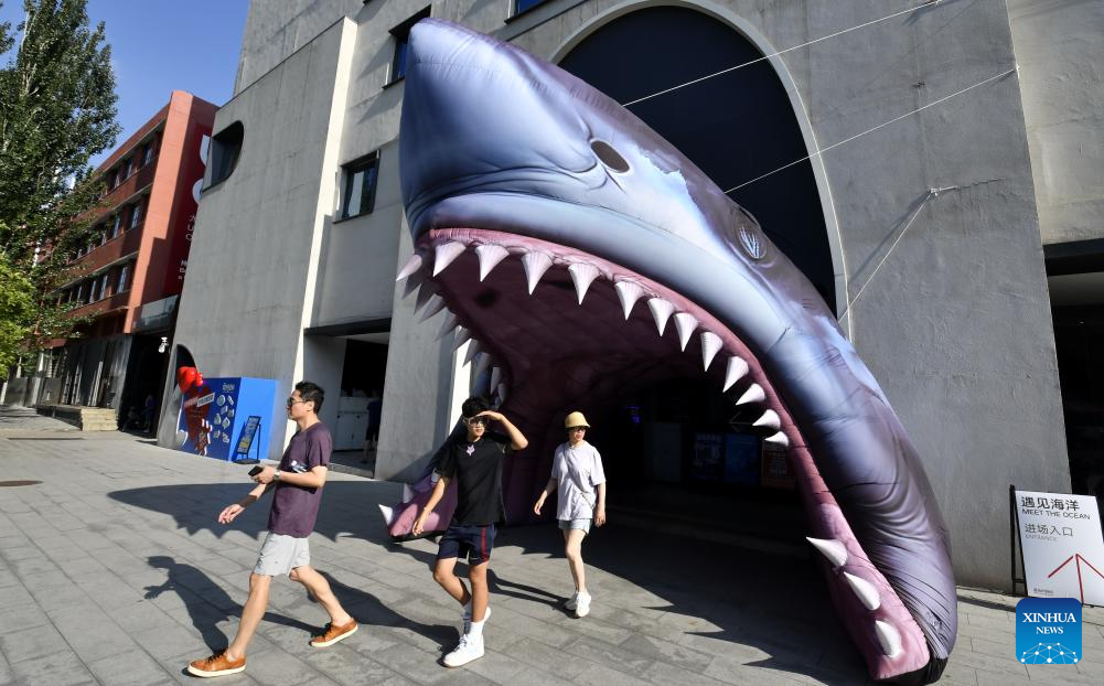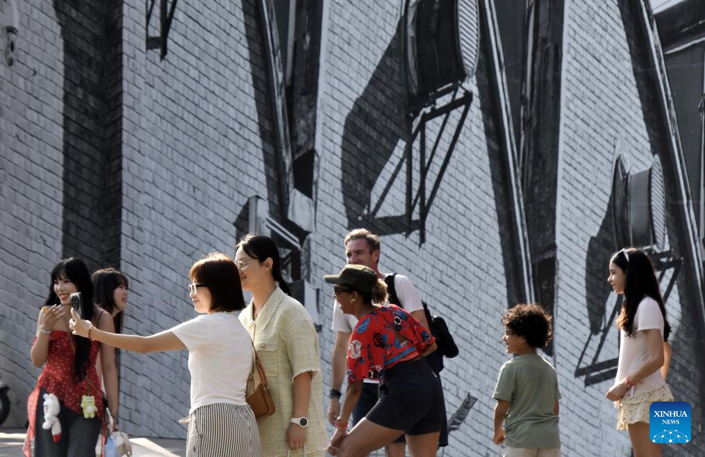 Tourists visit the 798 Art Zone in Beijing, capital of China, July 16, 2025. Built on the site of an abandoned factory complex, the 798 Art Zone, with age-old auburn bricks of its facade that are reminiscent of its industrial past, becomes a renowned place for museums and galleries of contemporary art. The art zone recorded 12.57 million visits in 2024. (Xinhua/Li Xin)