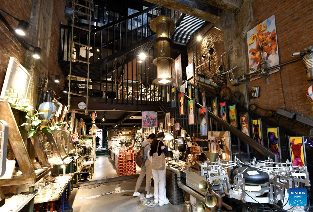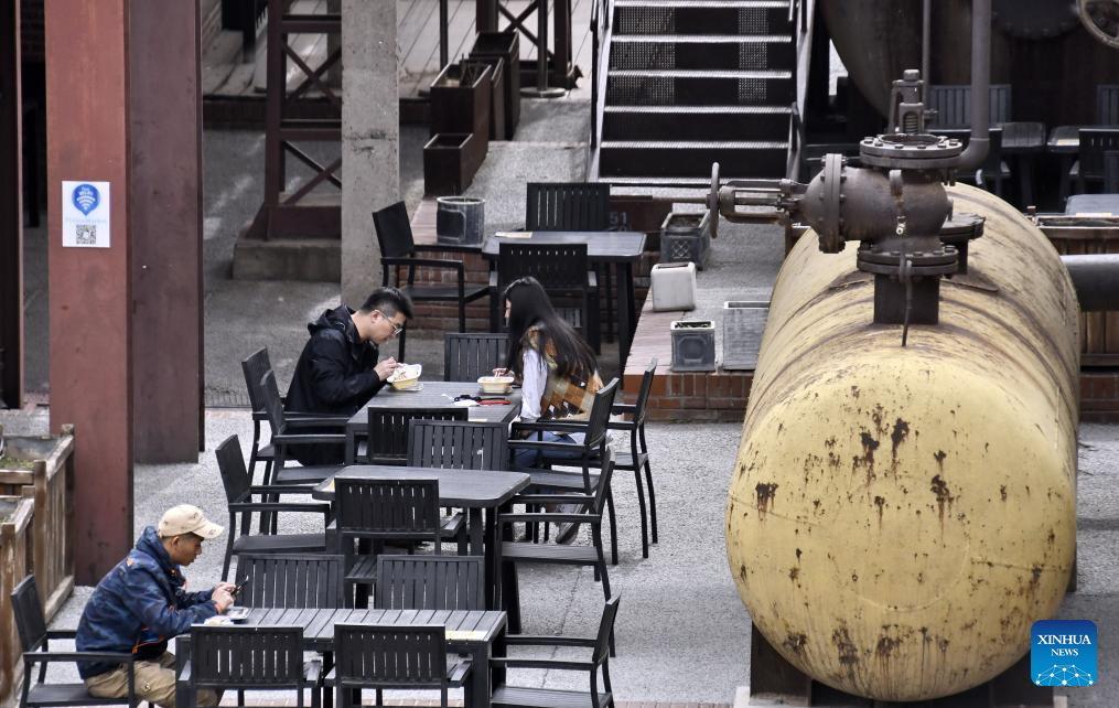 People dine at a restaurant at the 798 Art Zone in Beijing, capital of China, April 12, 2023. Built on the site of an abandoned factory complex, the 798 Art Zone, with age-old auburn bricks of its facade that are reminiscent of its industrial past, becomes a renowned place for museums and galleries of contemporary art. The art zone recorded 12.57 million visits in 2024. (Xinhua/Li Xin)