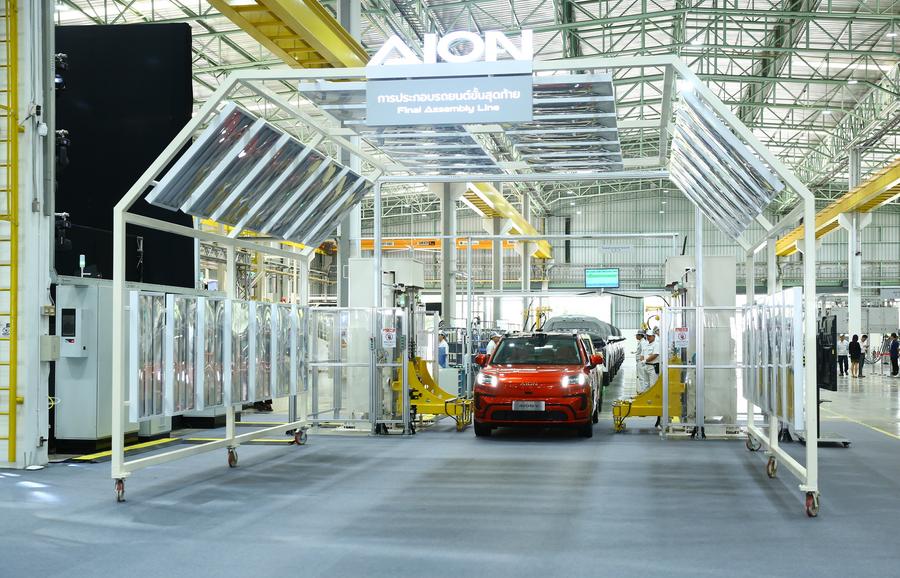 Staff members work at the electric vehicle (EV) factory of China's carmaker GAC Aion in Rayong province, Thailand on July 17, 2024. (Xinhua/Sun Weitong)
