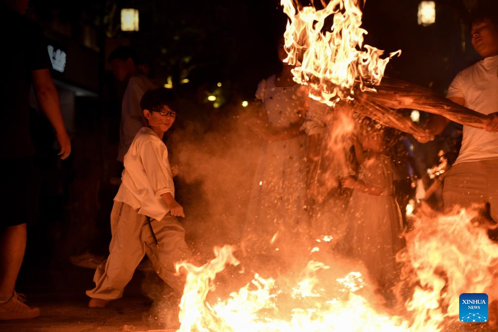 A tourist lights a torch at a torch festival in Weishan Yi and Hui Autonomous County, Dali Bai Autonomous Prefecture, southwest China's Yunnan Province, July 19, 2025. A torch festival kicked off here on Saturday. (Xinhua/Peng Yikai)