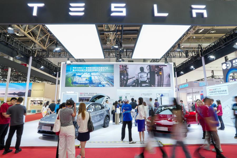 People visit the booth of TESLA at the Smart Vehicle Chain area of the third China International Supply Chain Expo (CISCE) in Beijing, capital of China, July 19, 2025.(Xinhua/Ju Huanzong)