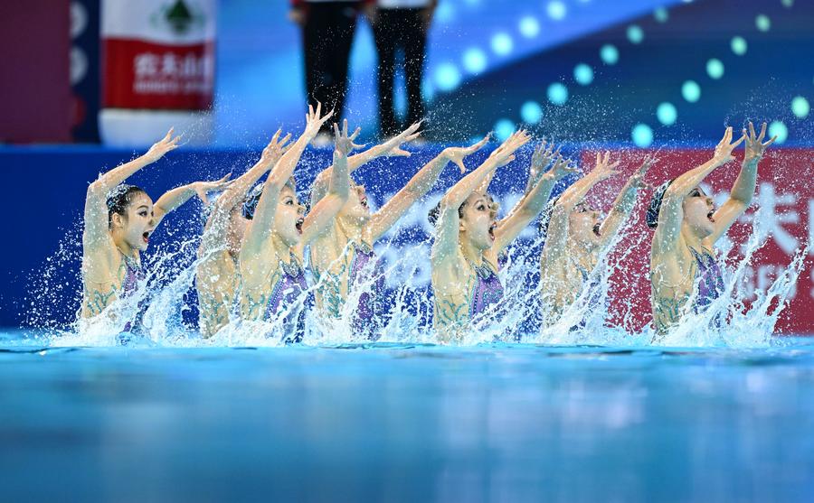 China performs during the team free routine final of artistic swimming. (Xinhua/Xia Yifang)