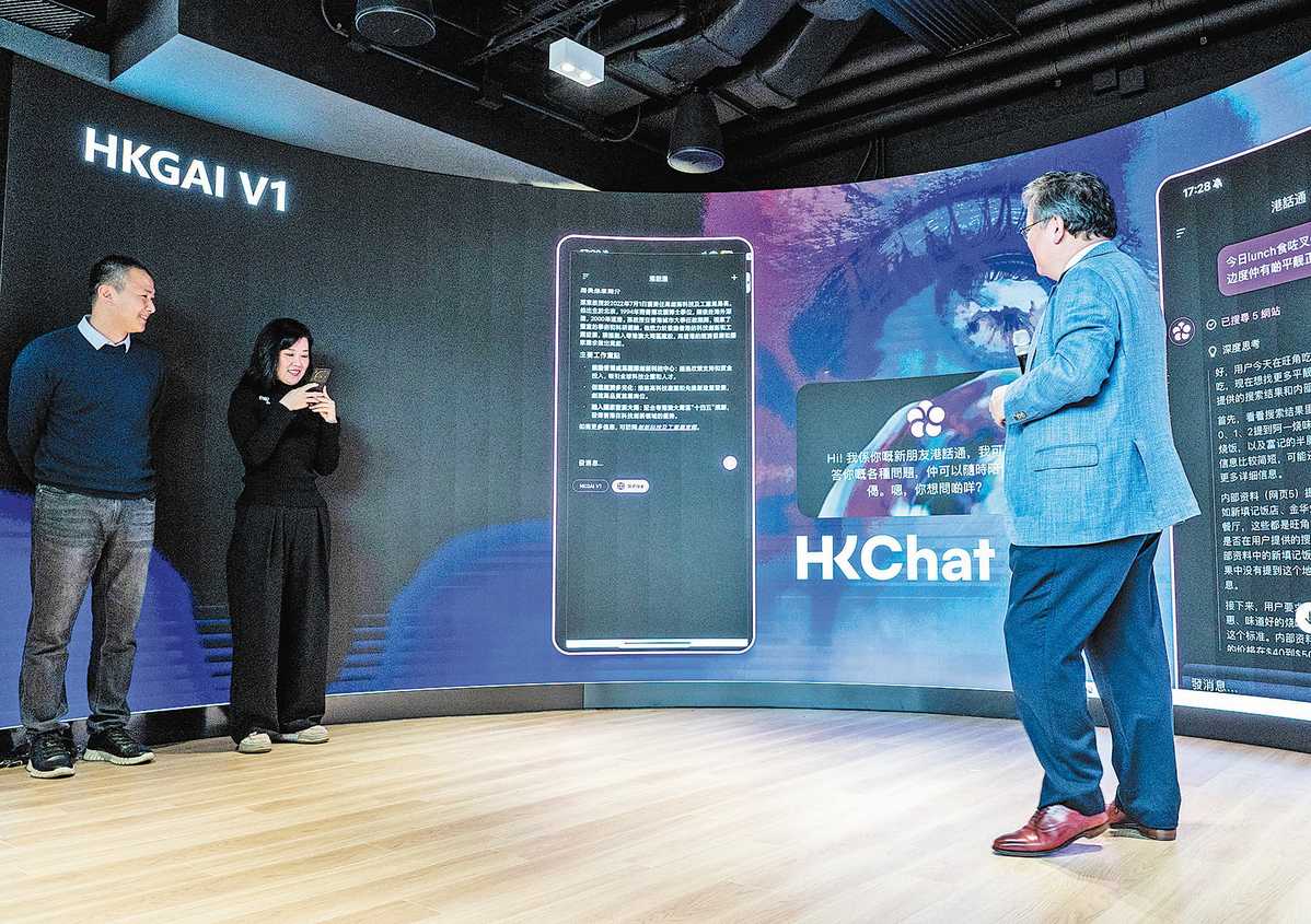Guo Yike (right), a data scientist and the provost of the Hong Kong University of Science and Technology, demonstrates the application of HKGAI V1 — Hong Kong's first homegrown artificial intelligence large language model. HOU YU/CHINA NEWS SERVICE