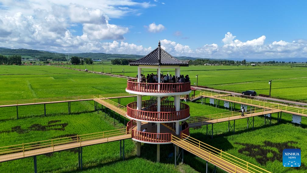 This photo taken on July 18, 2025 shows an organic paddy field in Guangdong Village, Helong City, northeast China's Jilin Province, July 18, 2025. Guangdong, a border village in Jilin Province of northeast China, received over 200,000 visits in 2024, accumulating an income of over 1 million yuan (about 139,317 U.S. dollars). (Xinhua/Shao Zedong)