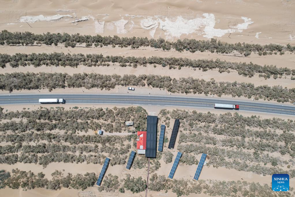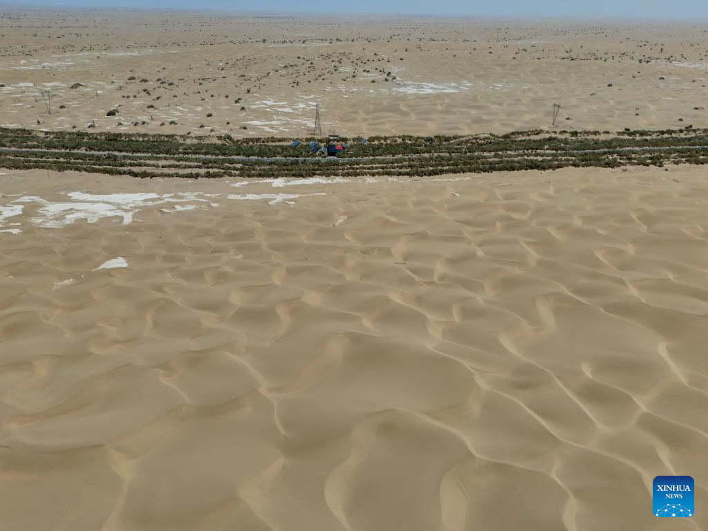 An aerial drone photo taken on July 18, 2025 shows a section of the Tarim Desert Highway and the shelterbelts planted along it in northwest China's Xinjiang Uygur Autonomous Region. The 522-kilometer highway runs across the Taklimakan Desert, the world's second-largest shifting sand desert. (Xinhua/Meng Tao)